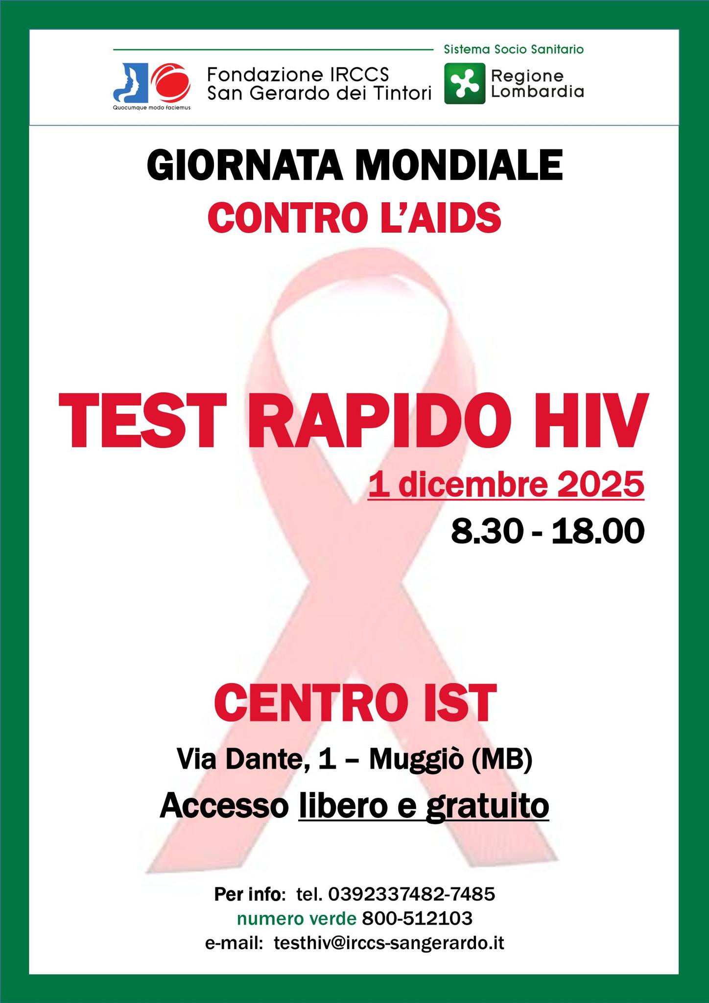 - Il Centro IST di Muggiò in via Dante 1, lunedì 1° dicembre, promuove un’apertura straordinaria fino alle 18.00, con accesso libero, per accogliere le persone che desiderano eseguire accertamenti o avere informazioni sull’HIV.